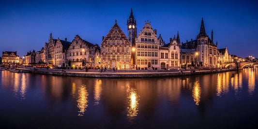 Europe-Belgium-Ghent-Panoramic of town and canal reflections at night Black Ornate Wood Framed Art Print with Double Matting by Jaynes Gallery