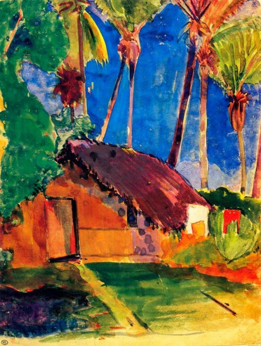 Thatched Hut Under Palm Trees Black Ornate Wood Framed Art Print with Double Matting by Gauguin, Paul