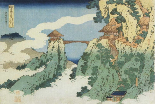 The Hanging Cloud Bridge At Mount Gyodo Near Ashikaga Black Ornate Wood Framed Art Print with Double Matting by Hokusai