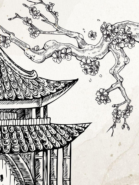 Pagoda Cherry Blossom 1 White Modern Wood Framed Art Print with Double Matting by Bailey, Ann