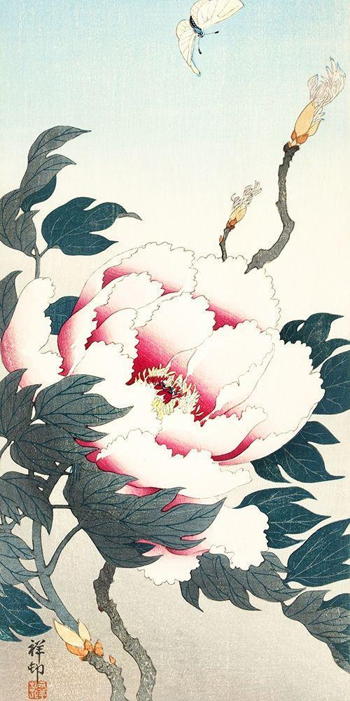 Peony with butterfly White Modern Wood Framed Art Print with Double Matting by Koson, Ohara
