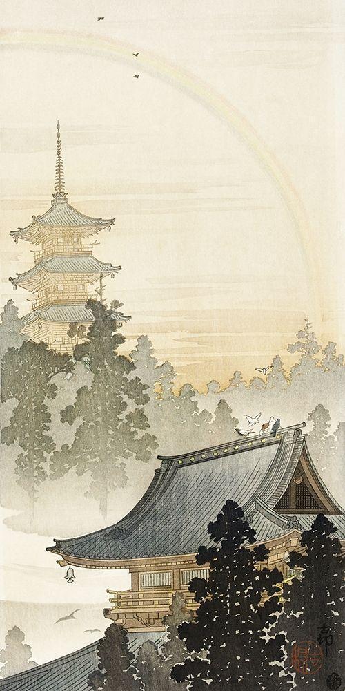 Pagoda and rainbow White Modern Wood Framed Art Print with Double Matting by Koson, Ohara