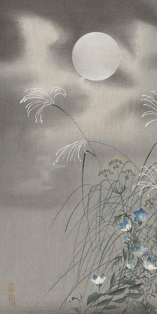 Grass and flowers at full moon White Modern Wood Framed Art Print with Double Matting by Koson, Ohara