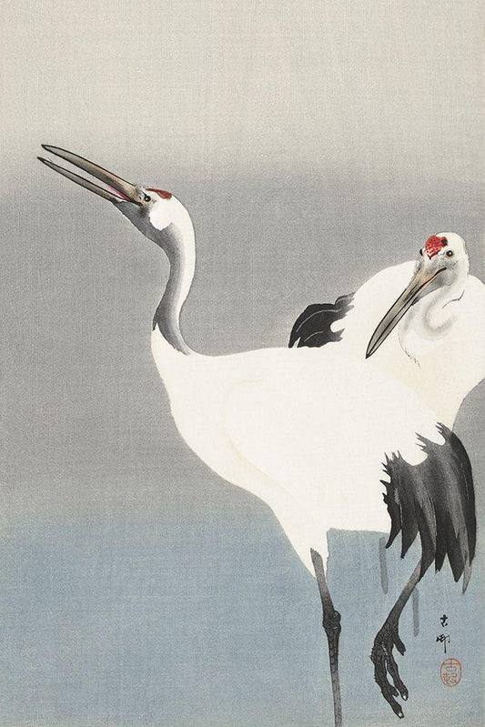 Two cranes White Modern Wood Framed Art Print with Double Matting by Koson, Ohara