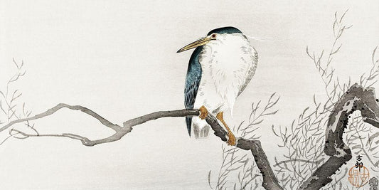 Heron in snow White Modern Wood Framed Art Print with Double Matting by Koson, Ohara