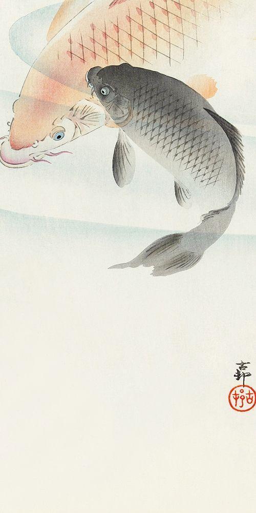 Two carp White Modern Wood Framed Art Print with Double Matting by Koson, Ohara