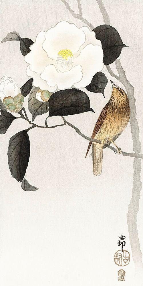 Songbird and flowering camellia White Modern Wood Framed Art Print with Double Matting by Koson, Ohara
