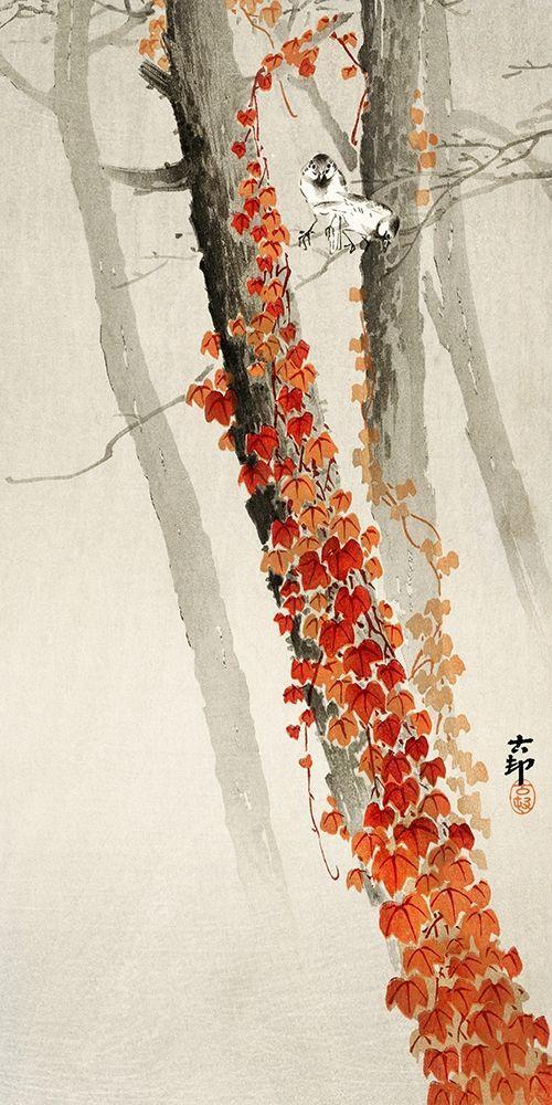 Red ivy White Modern Wood Framed Art Print with Double Matting by Koson, Ohara