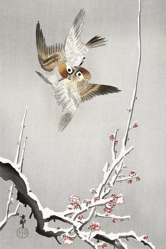 Sparrows and snowy plum tree White Modern Wood Framed Art Print with Double Matting by Koson, Ohara