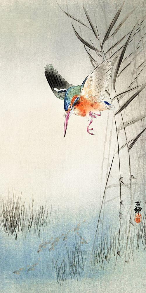Kingfisher hunting for fish in the water White Modern Wood Framed Art Print with Double Matting by Koson, Ohara