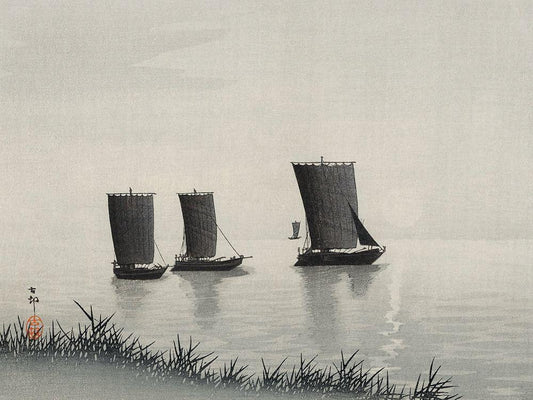 Fishing boats White Modern Wood Framed Art Print with Double Matting by Koson, Ohara