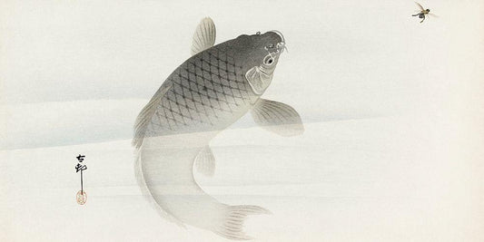 Carp and fly White Modern Wood Framed Art Print with Double Matting by Koson, Ohara