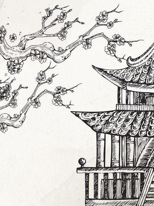 Pagoda Cherry Blossom 2 White Modern Wood Framed Art Print with Double Matting by Bailey, Ann