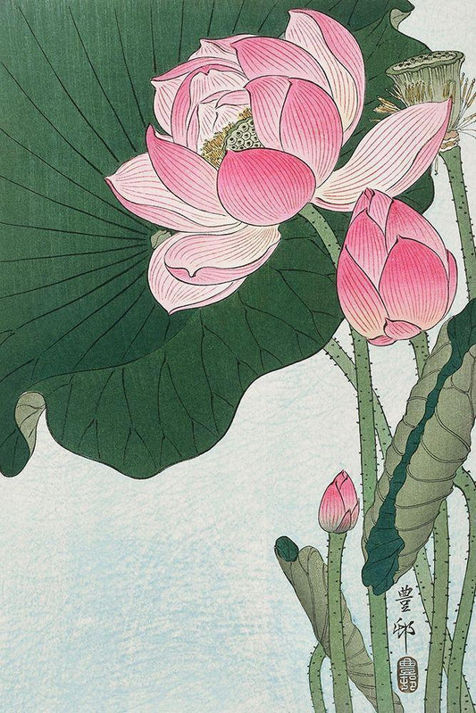 Blooming lotus flowers White Modern Wood Framed Art Print with Double Matting by Koson, Ohara