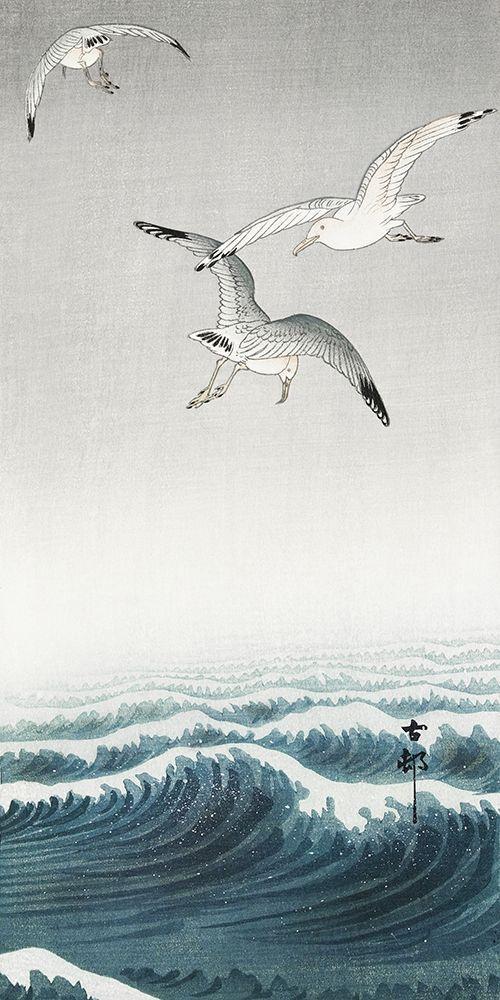 Three seagulls White Modern Wood Framed Art Print with Double Matting by Koson, Ohara
