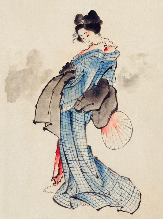 Woman, Full-Length Portrait, Wearing Kimono with Check Design White Modern Wood Framed Art Print with Double Matting by Hokusai, Katsushika