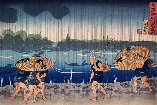 People Walking Beneath Umbrellas Along the Seashore During a Rainstorm White Modern Wood Framed Art Print with Double Matting by Kuniyoshi, Utagawa