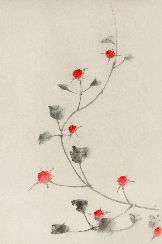 Small Red Blossoms on a Vine White Modern Wood Framed Art Print with Double Matting by Hokusai, Katsushika