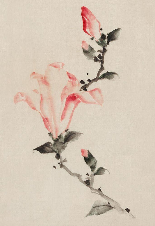 Large Pink Blossom on a Stem with Three Additional Buds White Modern Wood Framed Art Print with Double Matting by Hokusai, Katsushika