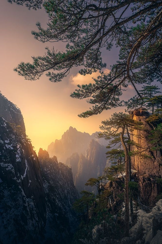 Strange Pine Tree In Yellow Mountain White Modern Wood Framed Art Print with Double Matting by Ye, Ningyun