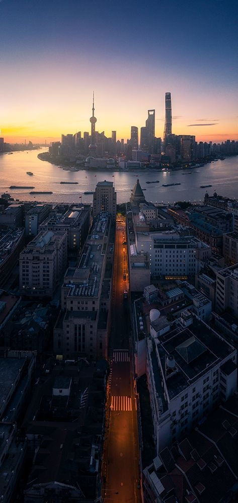 Shanghai Sunrise White Modern Wood Framed Art Print with Double Matting by Tan, Jasper