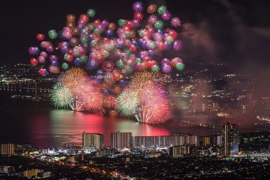 Lake Biwa Fireworks White Modern Wood Framed Art Print with Double Matting by Ito, Tatsuki