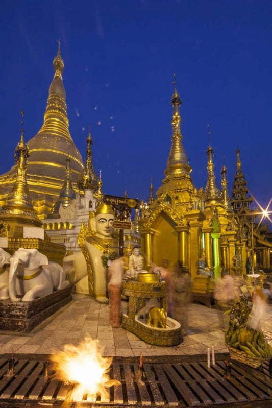 Myanmar, Yangon Shwedagon Temple at sunset White Modern Wood Framed Art Print with Double Matting by Zuckerman, Jim
