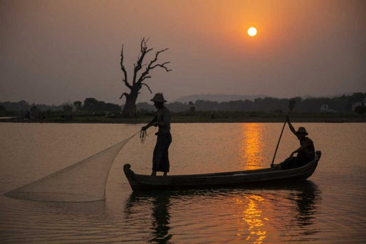 Myanmar, Amarapura Fishermen on Irrawaddy River White Modern Wood Framed Art Print with Double Matting by Zuckerman, Jim