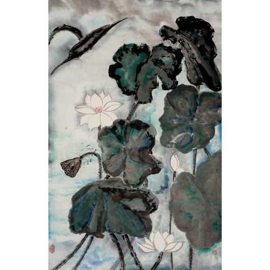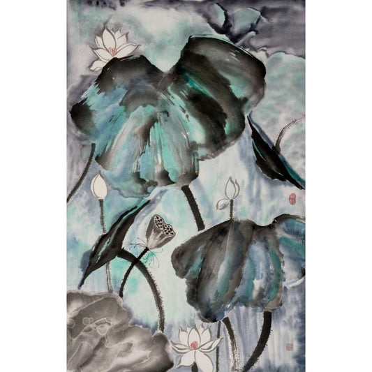 Lotus Study with Blue Green II Gold Ornate Wood Framed Art Print with Double Matting by Rae, Nan