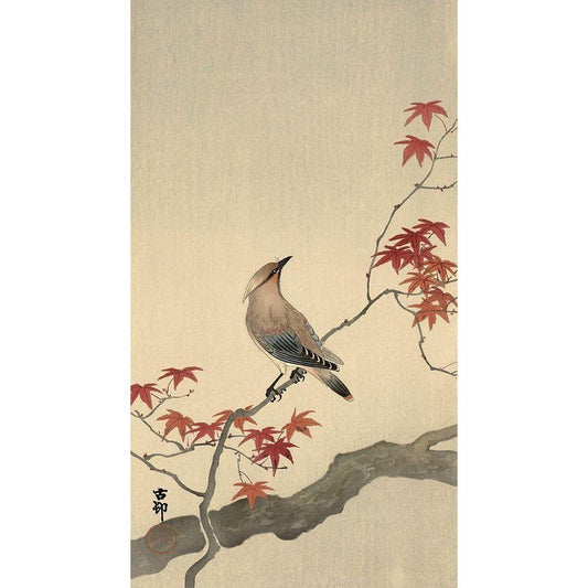 Japanese Waxwing on Maple, 1900-1936 Gold Ornate Wood Framed Art Print with Double Matting by Koson, Ohara