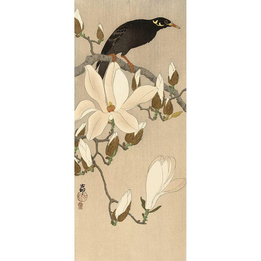 Myna on Magnolia Branch, 1900-1910 Gold Ornate Wood Framed Art Print with Double Matting by Koson, Ohara