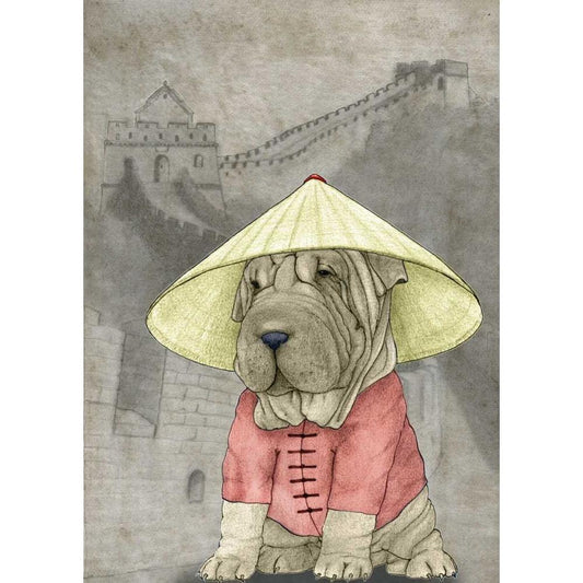 Shar Pei with the Great Wall Gold Ornate Wood Framed Art Print with Double Matting by Barruf