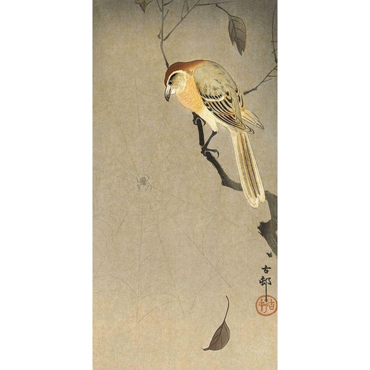 Buffalo wing shrike and spider Black Modern Wood Framed Art Print by Koson, Ohara