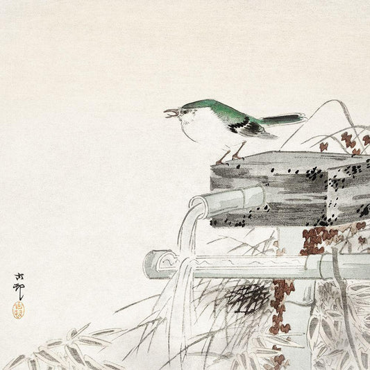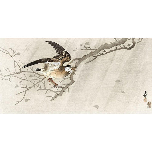 Gray starling in storm Black Modern Wood Framed Art Print by Koson, Ohara