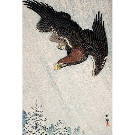 Eagle Flying in Snow Black Modern Wood Framed Art Print by Koson, Ohara