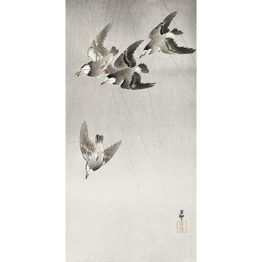 Starlings in the rain Black Modern Wood Framed Art Print by Koson, Ohara