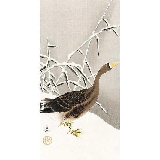 White-fronted goose in the snow Black Modern Wood Framed Art Print by Koson, Ohara