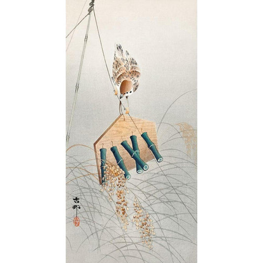 Ring sparrow on scarecrow Black Modern Wood Framed Art Print by Koson, Ohara