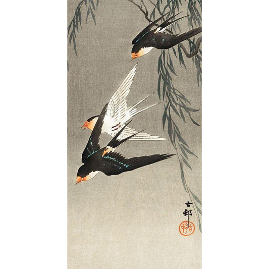Three red-tailed swallows in dive Black Modern Wood Framed Art Print by Koson, Ohara