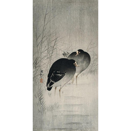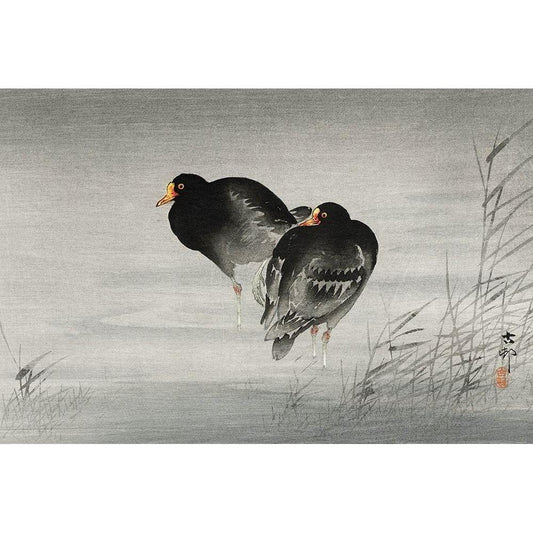 Two moorhens Black Modern Wood Framed Art Print by Koson, Ohara