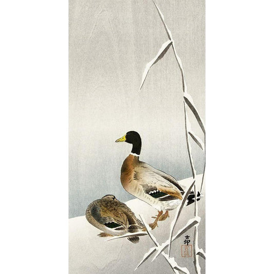 Two ducks on snowy reed Black Modern Wood Framed Art Print by Koson, Ohara