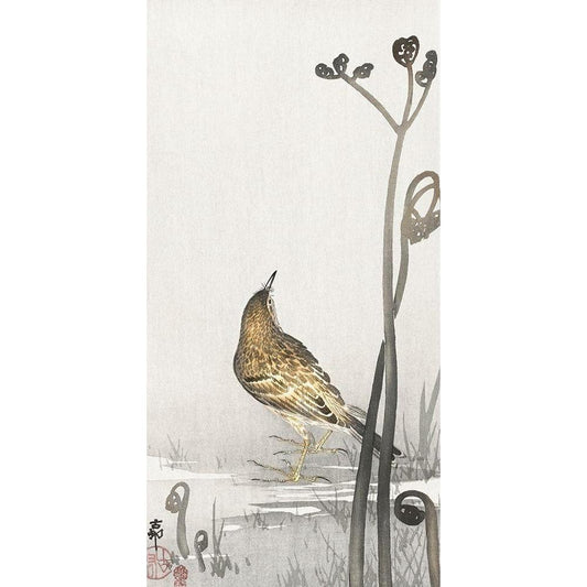 Pipit on a waterfront Black Modern Wood Framed Art Print by Koson, Ohara