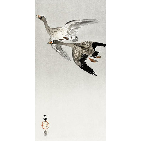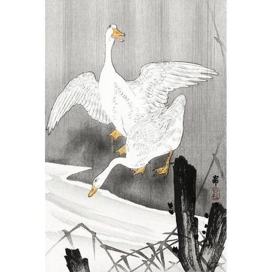 Great geese, flying in the snow Black Modern Wood Framed Art Print by Koson, Ohara