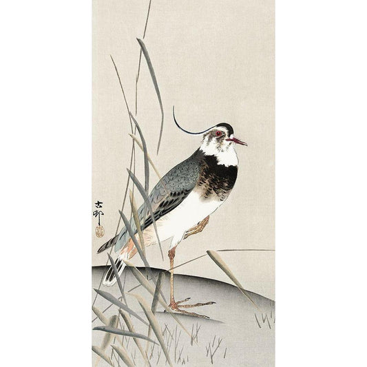 Lapwing and reed Black Modern Wood Framed Art Print by Koson, Ohara