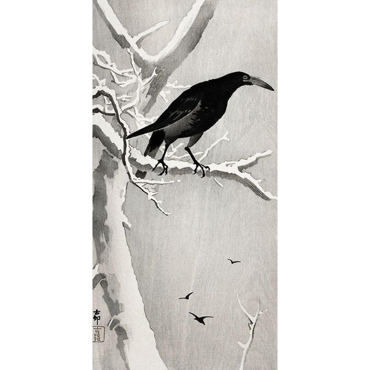 Crow on snowy tree branch Black Modern Wood Framed Art Print by Koson, Ohara