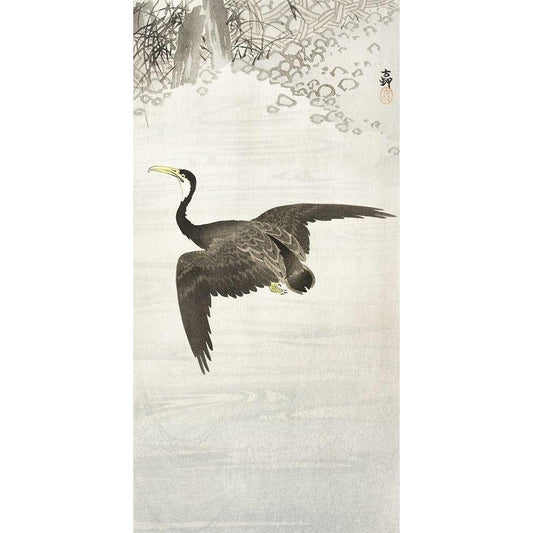 Cormorant in flight Black Modern Wood Framed Art Print by Koson, Ohara