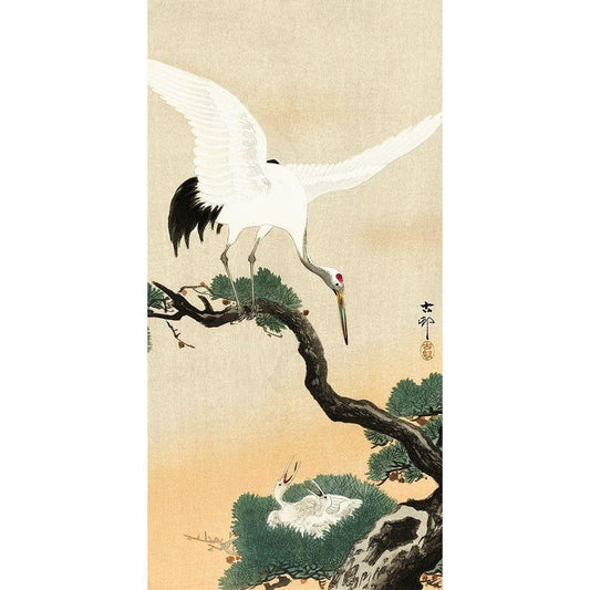 Japanese crane bird on branch of pine Black Modern Wood Framed Art Print by Koson, Ohara