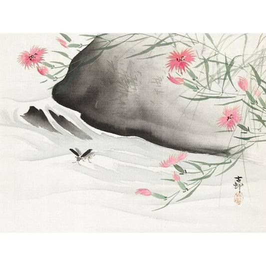 Plants with pink flowers by the river Black Modern Wood Framed Art Print by Koson, Ohara