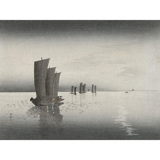 Fishing boats at dusk Black Modern Wood Framed Art Print by Koson, Ohara