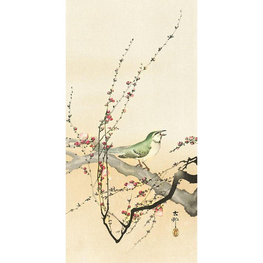 Songbird and plum blossom Black Modern Wood Framed Art Print by Koson, Ohara